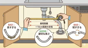 現在のホースの全長を測るだけでなく、「排水口から接続部までの最短距離 + 10cm程度の余裕」を確認してください。
