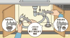 排水ホースの接続部は、数ミリの差で水漏れにつながります。定規ではなく、できれば「ノギス」を使ってコンマ数ミリまで確認するのが理想です。
